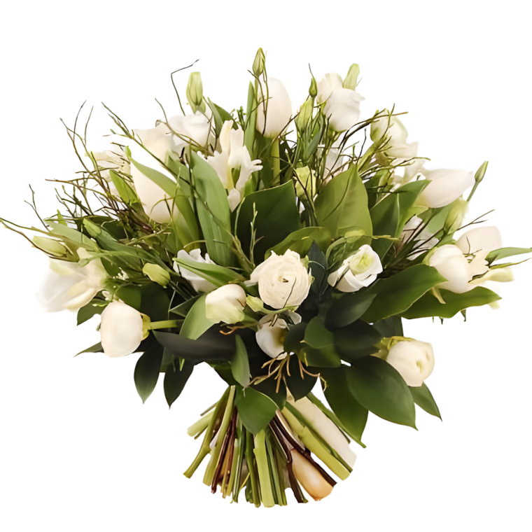 Winterboeket op basis van Eustoma's, Callassen en Rozen afgewerkt met Bosbes en Ruscus.