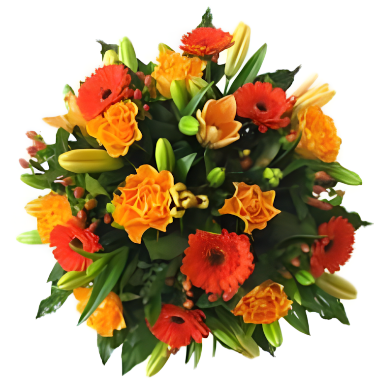 Herfstboeket met Mini-Gerbera's, Rozen, Lelies en Hypericum afgewerkt met Salal.