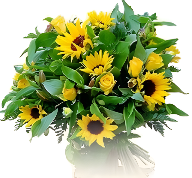 Boeket op basis van Zonnebloemen, Rozen, Hypericum, Alstroemeria en Eucalyptus. Afgewerkt met groen (Salal en/of Lederblad).