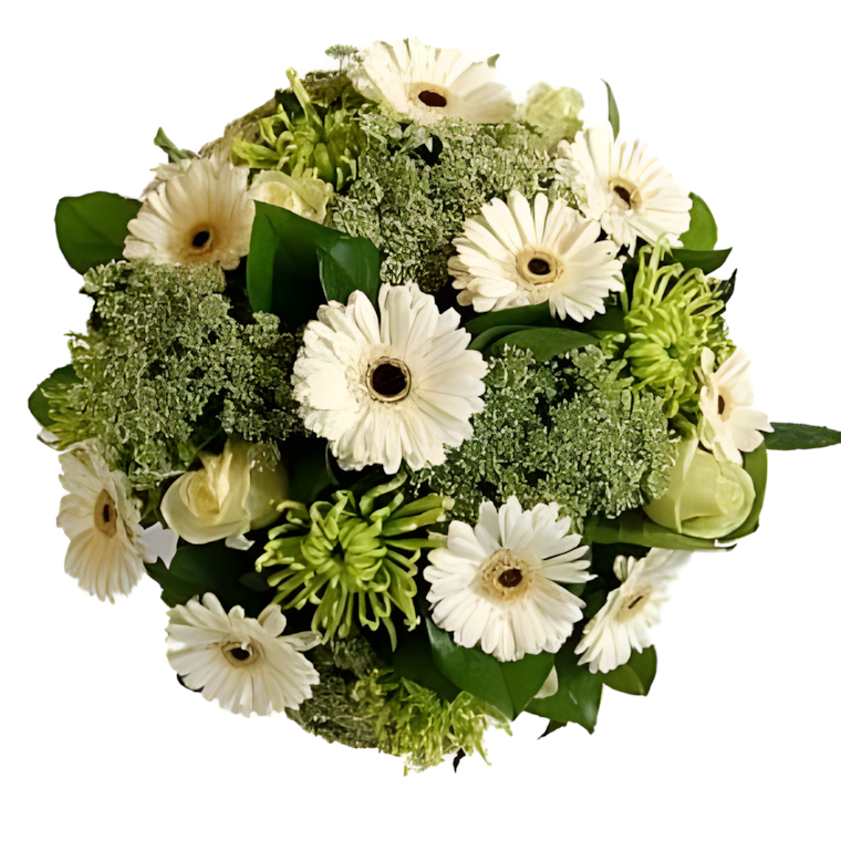 Boeket met witte bloemen op basis van Rozen, Trachelium, Mini-Gerbera, Alstroemeria. Afgewerkt met groen (Salal).