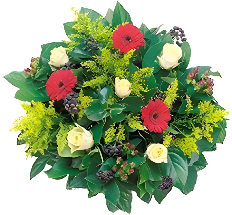 Boeket op basis van Mini-Gerbera, Solidago, Hypericum, Rozen en afgewerkt met groen (Salal)